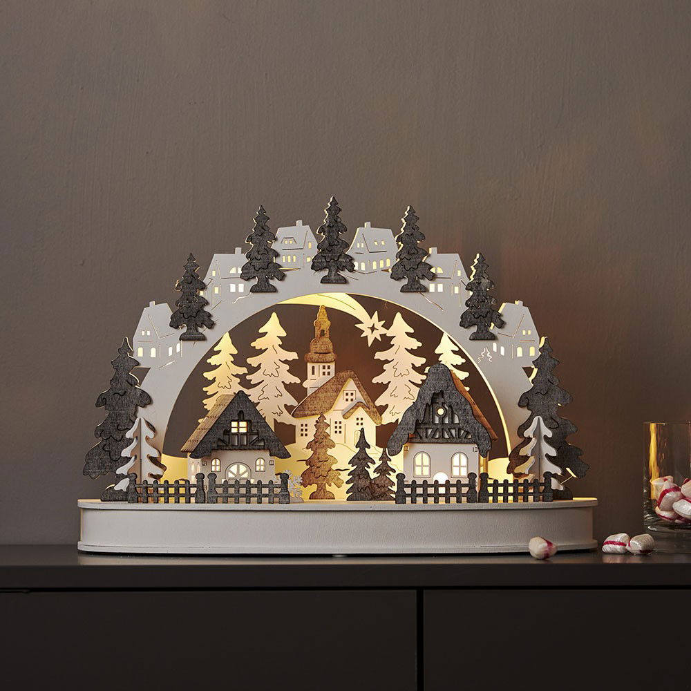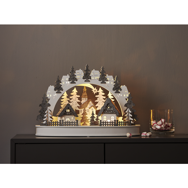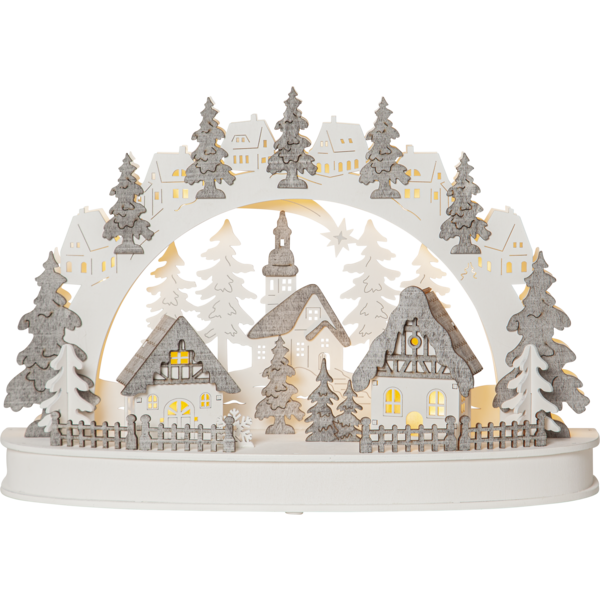 Detaljrik laserskuren ljusstake i trä, basen har ett vackert utskuret lanskap med små hus och ovan på basen böjer sig en båge med granar för att rama in den lilla detaljrika byn. Dekorera till advent och jul, placera ljusstaken i ett fönster eller på en byrå för att få den perfekta julkänslan.Färg:- Grå