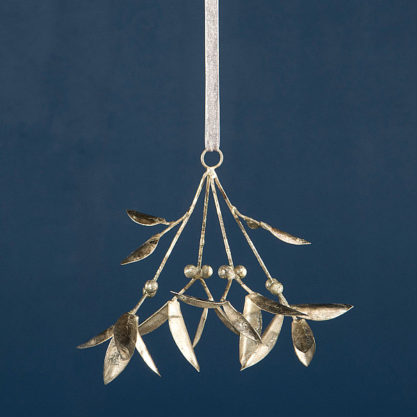 En vacker mistel i champagnefärgad antikbehandlad metall att hänga upp i dörrposten. En fin dekoration att hänga upp till jul. Ring upptill för upphängning