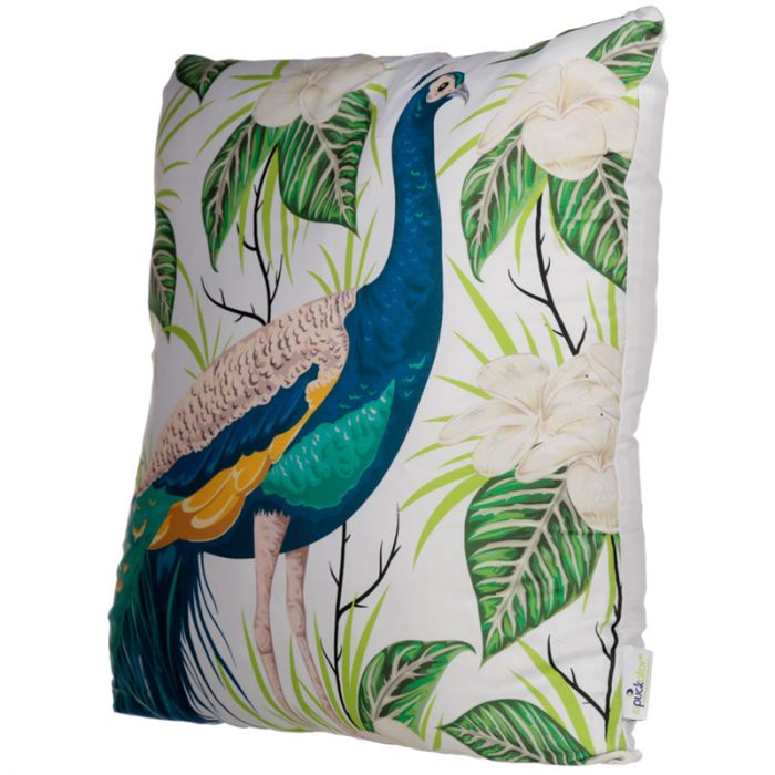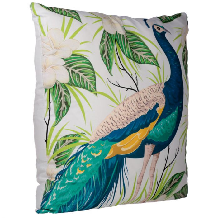 Vackert kudde i polyester med färgglatt motiv av påfåglar och blommor.