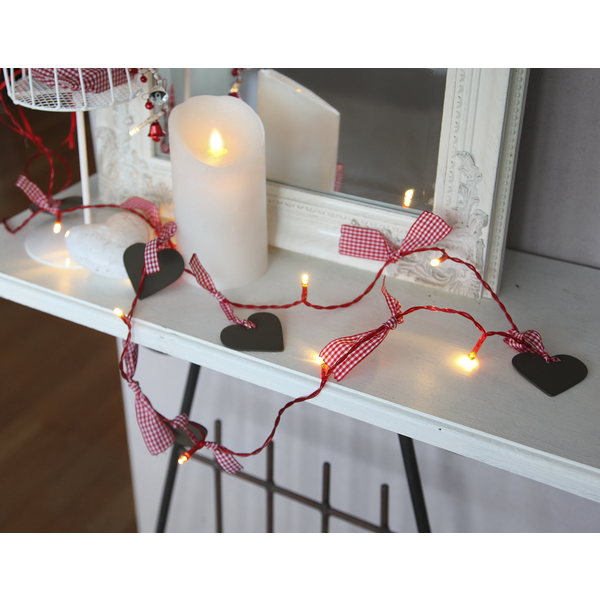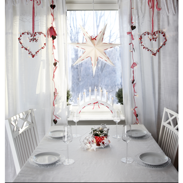 En dekorativ ljusslinga med många dekorationsmöjligheter i hemmet. Ljusslingan är röd och har många vackra detaljer. Slingan har en timer med repetitionsminne - det betyder att du kan ha den påslagen i 6 h och av i 12 h. Varje dygn slås den på automatiskt. Vill du ändra tiden, är det lätt gjort. Batterihållare, smart dold i en liten tygpåse som passar in i hela arrangemanget.