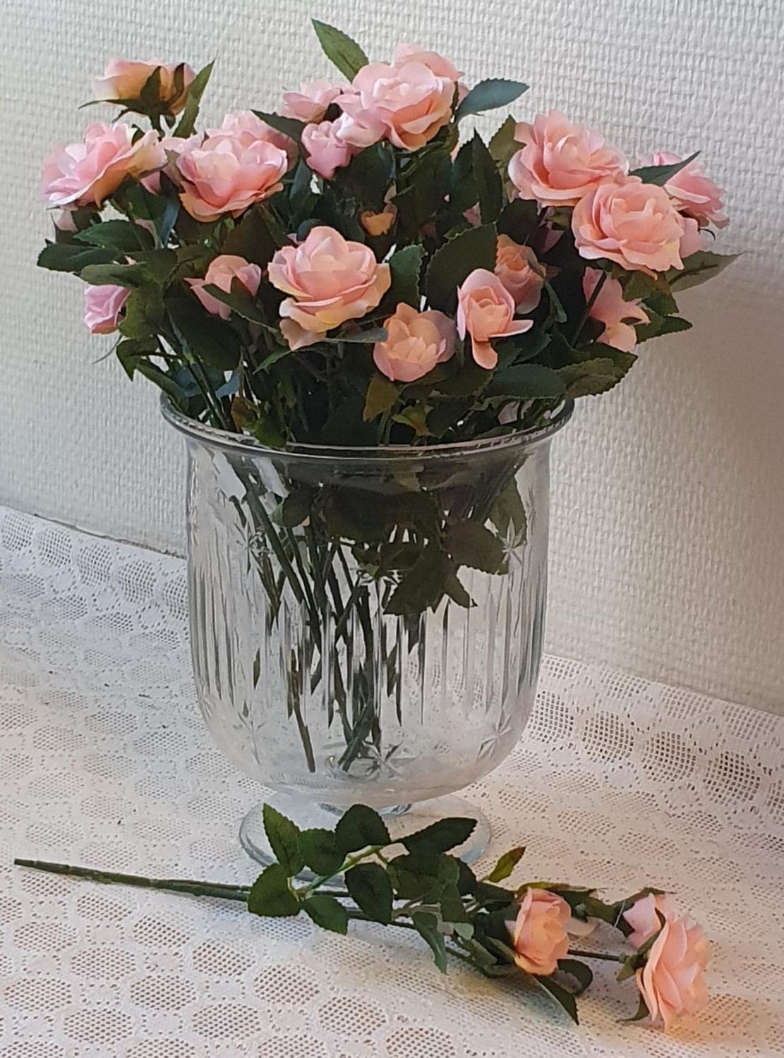 Vacker kvist med vita rosor och gröna blad, ser mycket verklig ut. Perfekt i den låga vasen för bordsdekorationer. Höjd:- 27cm