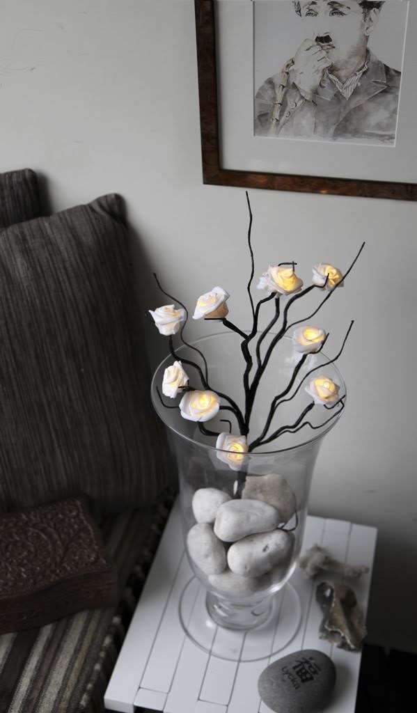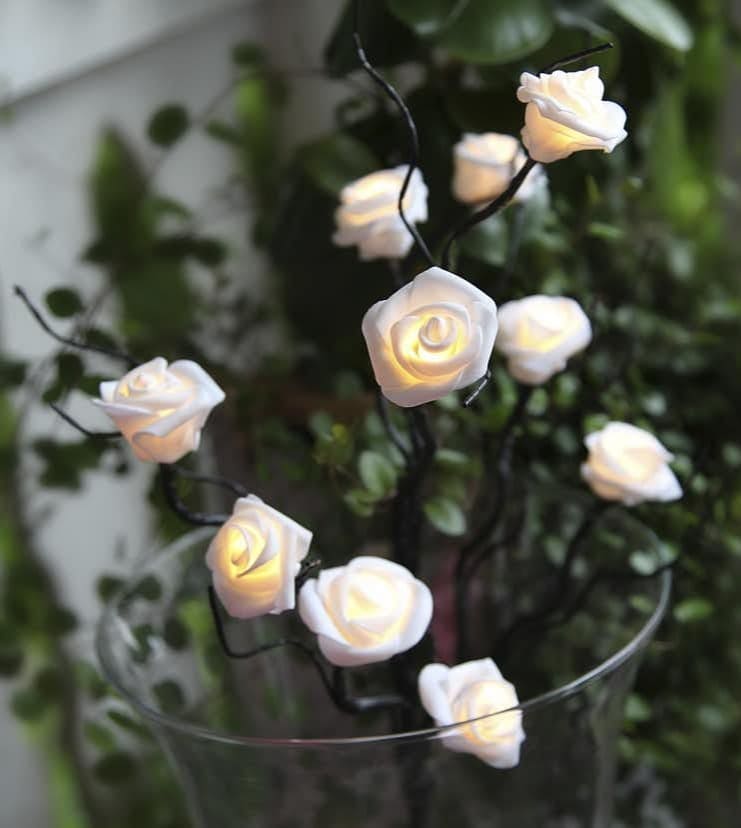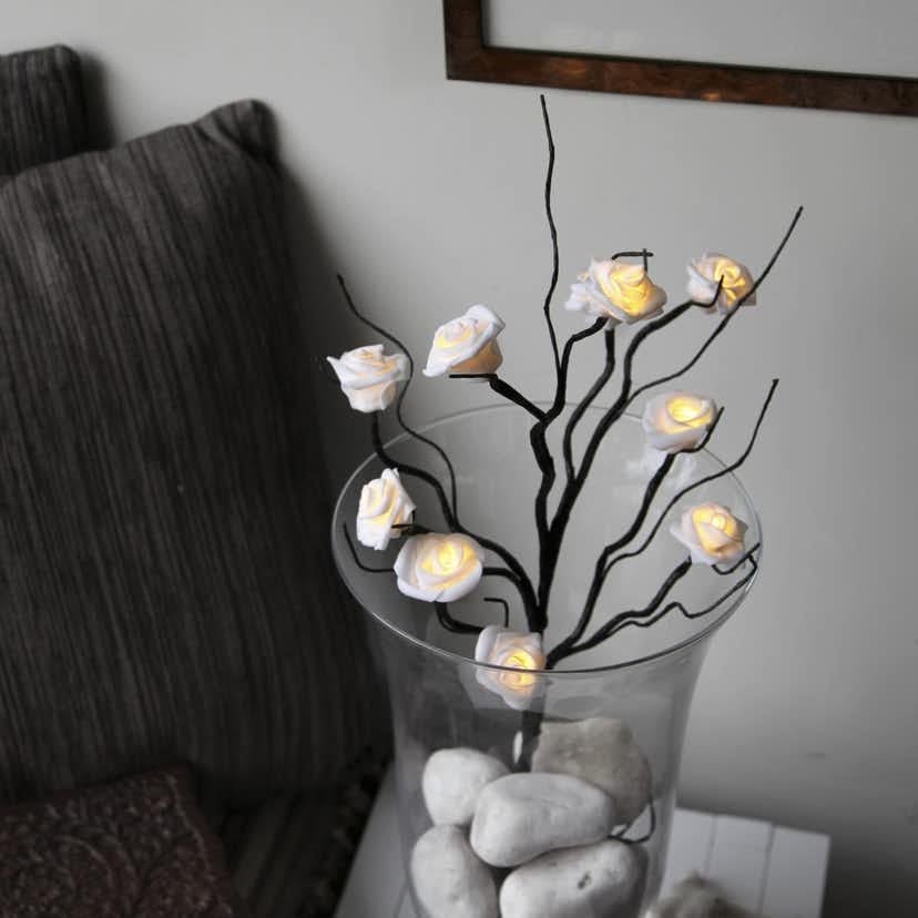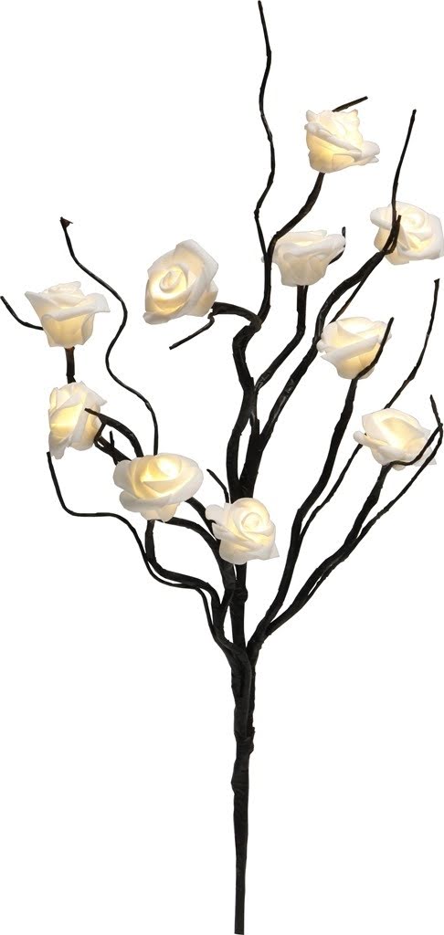 Vackert dekorationsträd med 10 vita rosor. 10 LED- lampor, en i varje ros. Drivs med 3 AA batterier. Perfekt att placera i en vas för en hemtrevlig känsla och en mysig belysning.