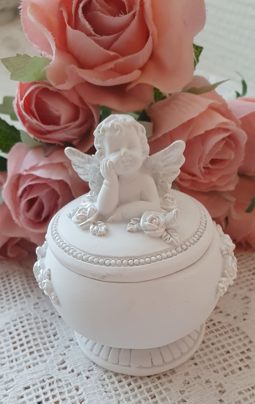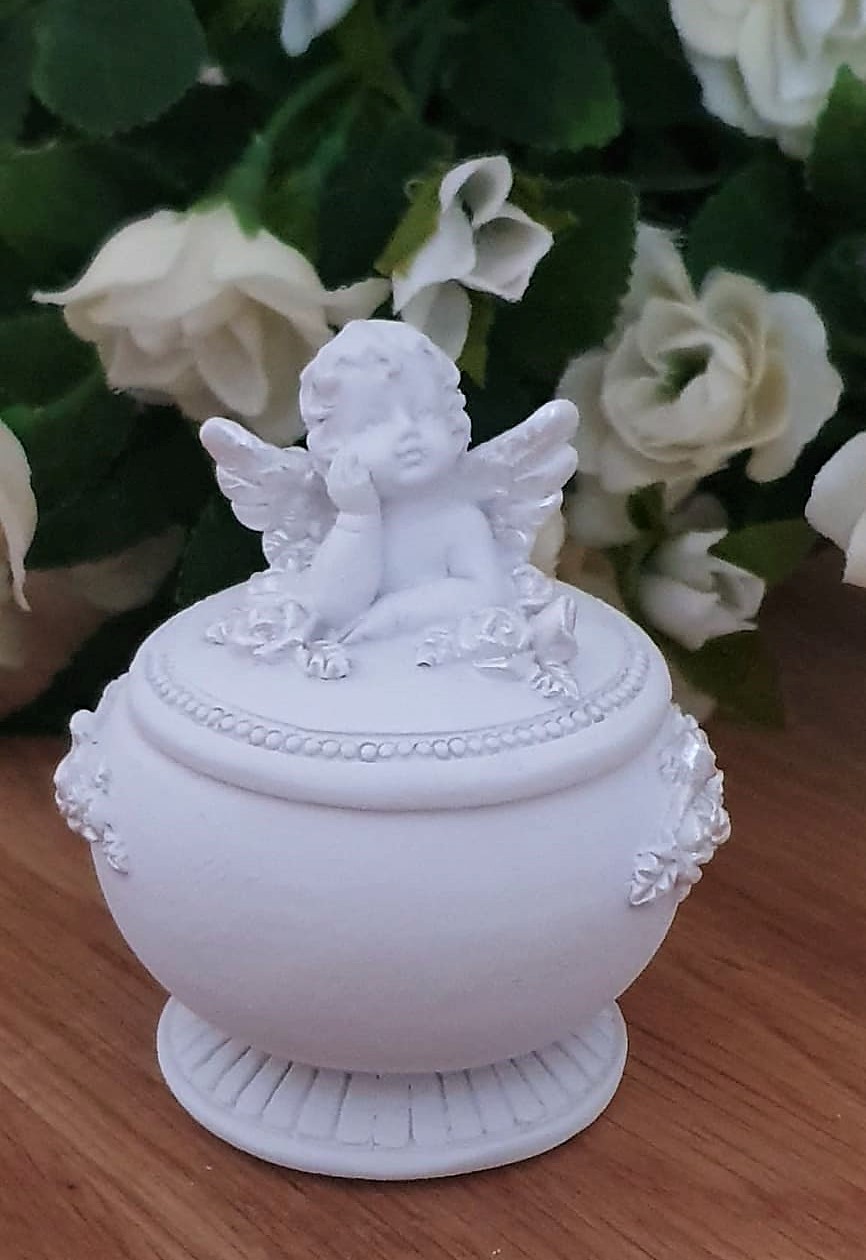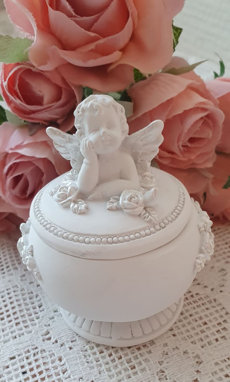 En oerhört söt handmålad liten ask med ängel på locket. Passar perfekt som dopgåva eller present till en liten nyfödd bebis. OBS:- Handgjord angel, v