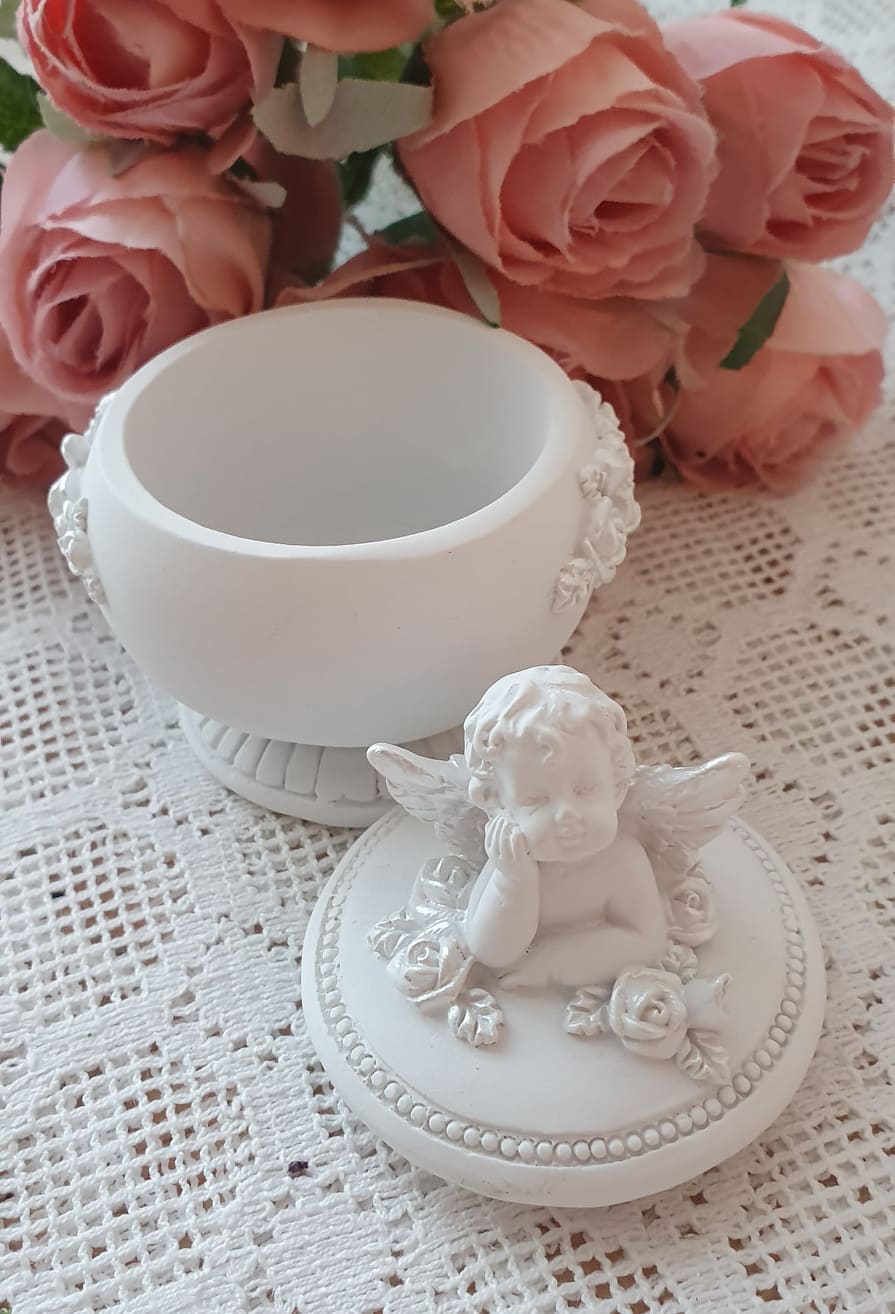 En oerhört söt handmålad liten ask med ängel på locket. Passar perfekt som dopgåva eller present till en liten nyfödd bebis.