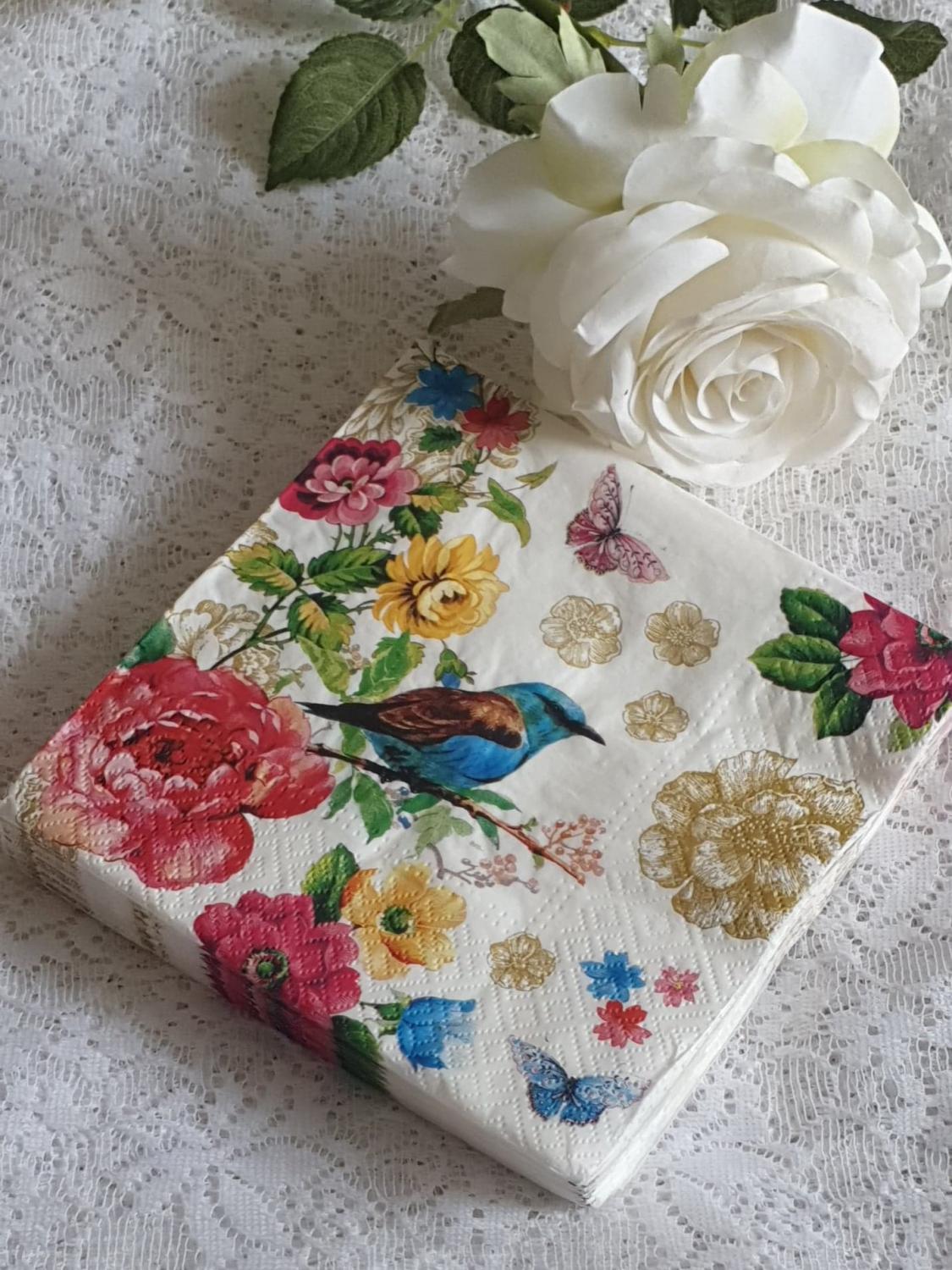 Vackra servetter med fågelmotiv och blommor. Fina pappersservetter. 3-lager. Innehåller 20 st. Vattenbaserade färger, miljövänliga, blekta utan klor
