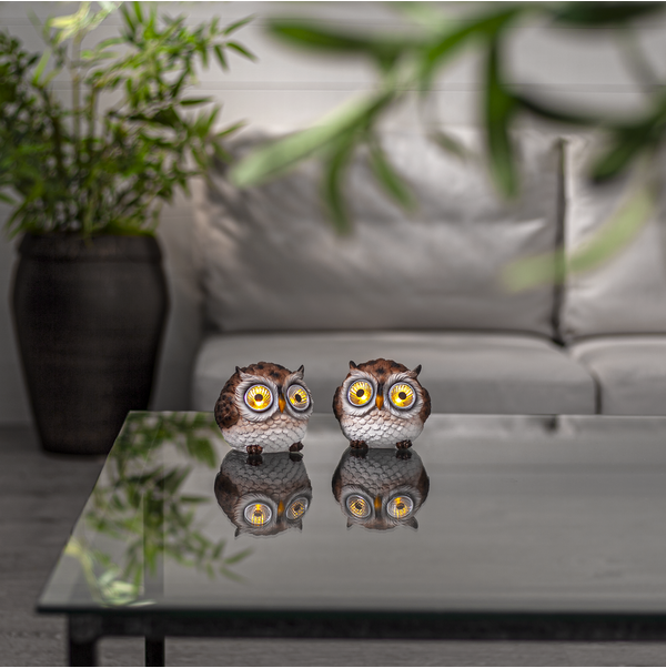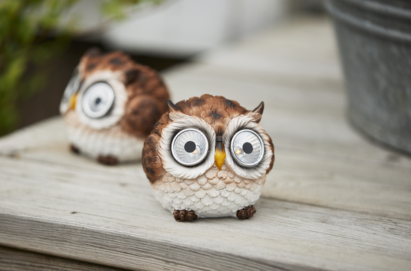 Söt solcellsbelysning i form av uggla som lyser med gula ögon i mörkret. Den är fin att placera som dekoration i din trädgård eller på en balkong. Placera den gärna så att solen når panelen för att uppnå den bästa laddningen till det medföljande batteriet under dagen så att de kan lysa under natten.