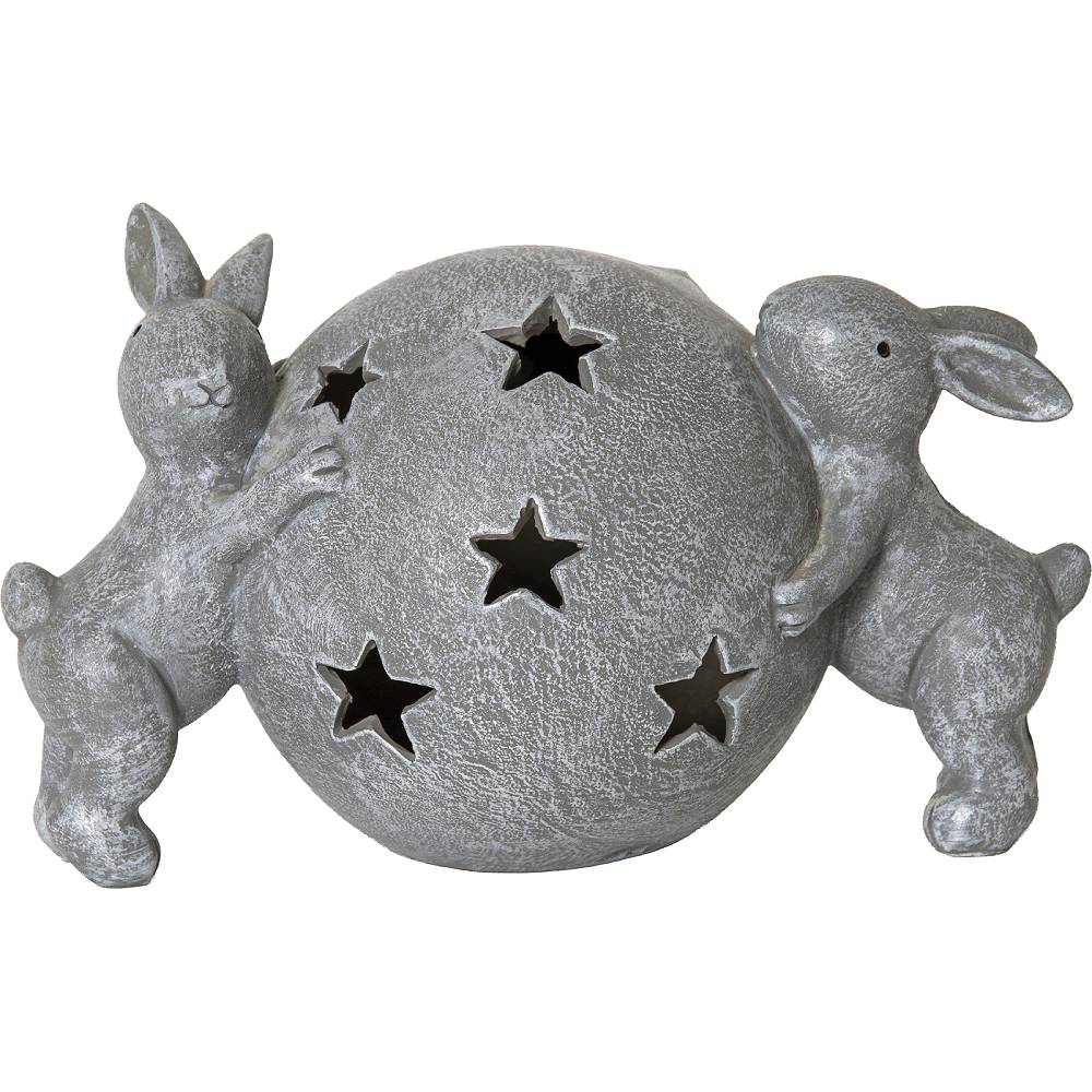 Solcellsdekoration tillverkad av polyresin som imiterar granit. 2 kaniner håller en boll som lyser med ett varmvitt ljus genom bollens stjärnhål. Det medföljande batteriet laddas av solen under dagen och gör att ljuset tänds när det blir mörkt.