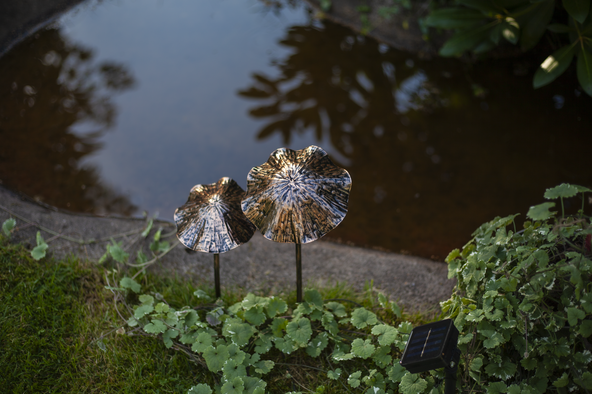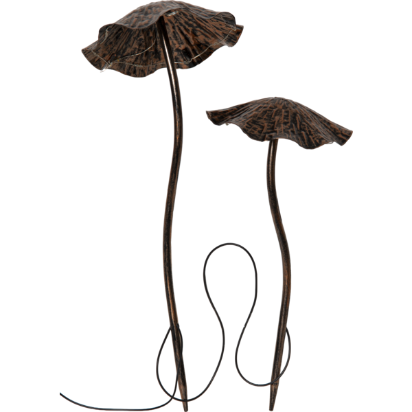 Solcellsdekoration i form av 2 svampar gjorda i bronsmålad metall.
