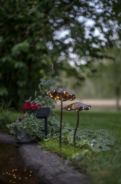 Solcellsdekoration i form av 2 svampar gjorda i bronsmålad metall. Under varje svamphatt sitter små micro led som lyser med ett varmvitt sken när mörkret faller, 10 led under den ena och 12 led under den andra. Batteriet som medföljer laddas av solen under dagen och gör att dekorationen lyser när det mörknar. Solcellspanelen sitter med 100cm kabel från den sista svampen vilket gör det enkelt att placera panelen i solen och dekorationen på önskat ställe.