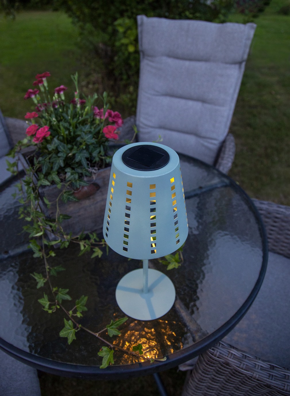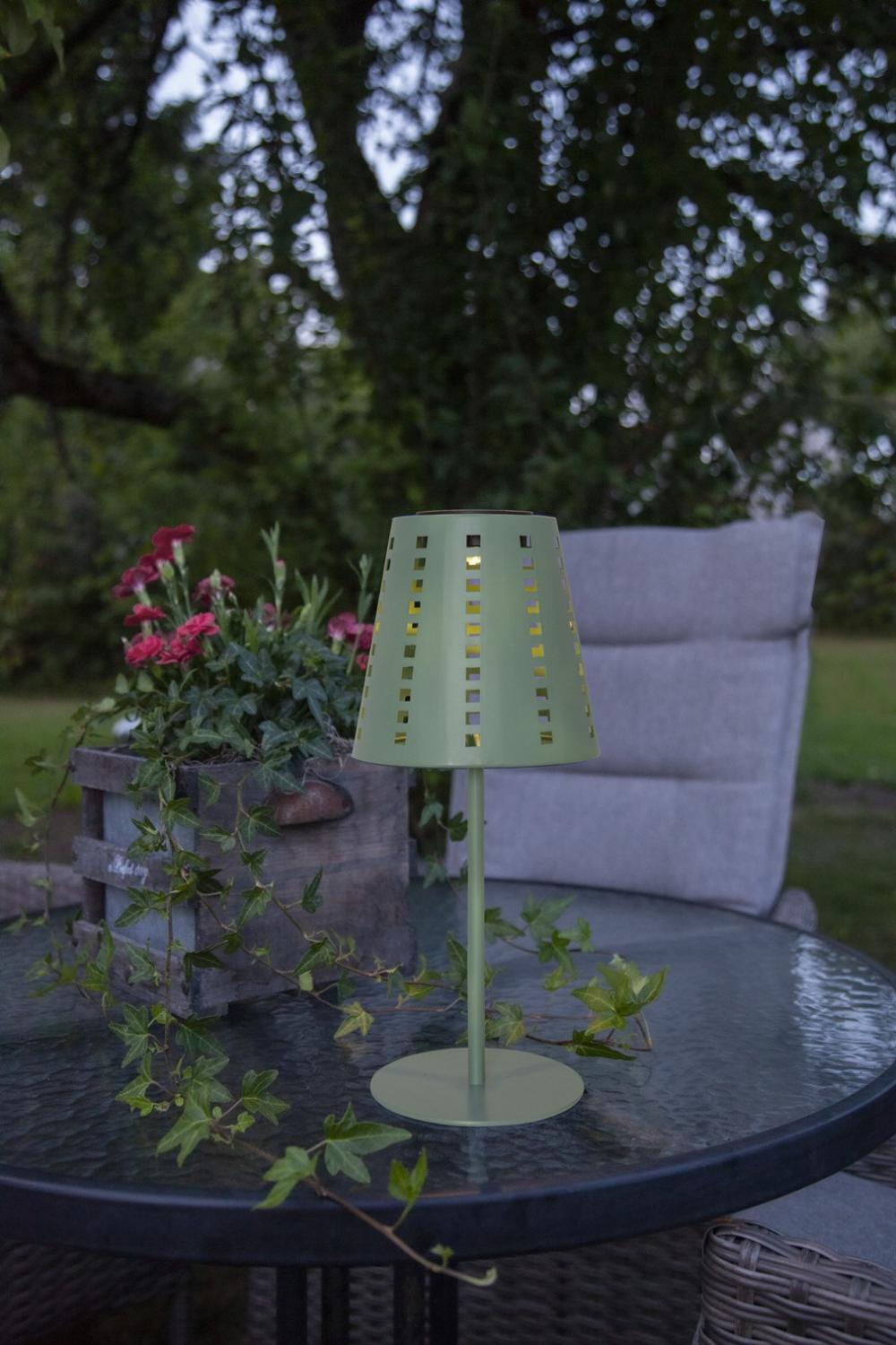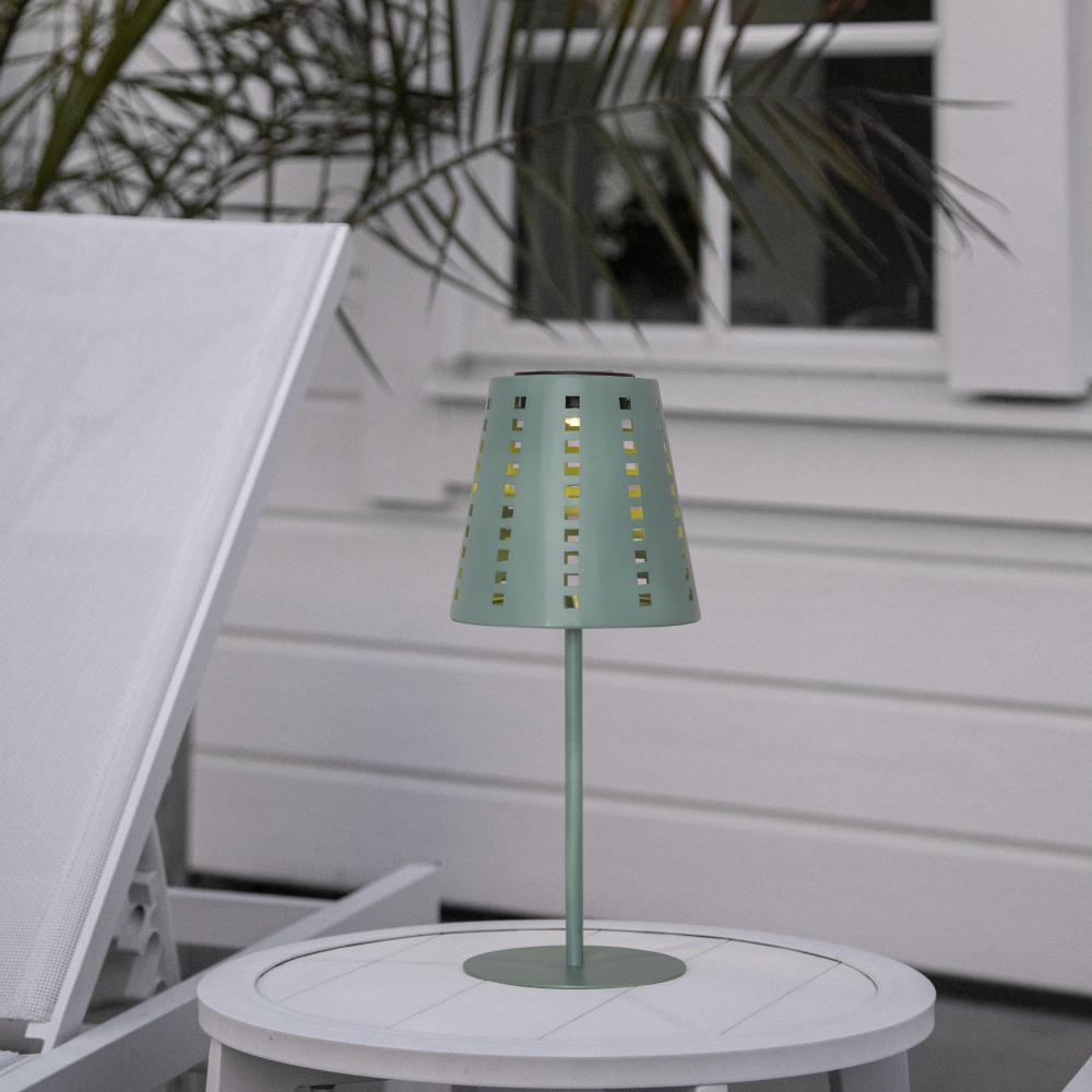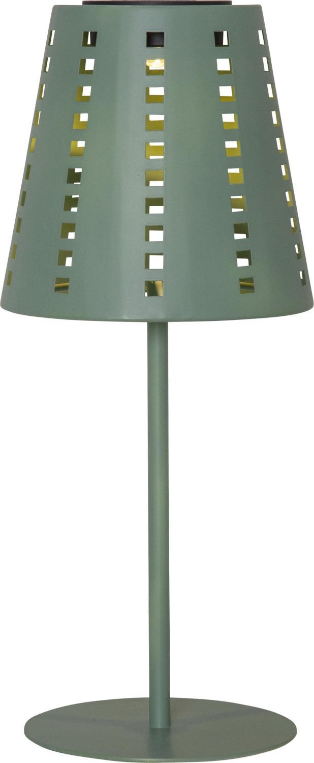 En stilren solcellsbelysning i grön plåt med ett vackert rutnät i skärmen som lyser upp med 5 Lumen i mörkret. Den är lättplacerad på din uteplats eller balkong som bordsbelysning. Placera solcellslampan så att panelen får direkt solljus under dagen för att ladda det medföljande batteriet på bästa sätt.