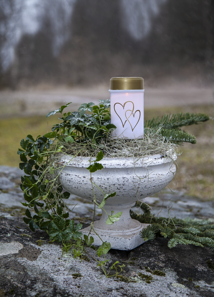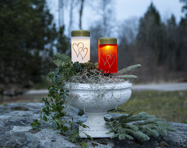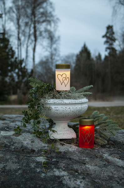 Solcellsljuset Hjärta är ett plastljus med hjärtdekor tryckt på. En vacker dekoration till en minnesplats eller bara som ett ljus att sätta i en lykta. Tack vare den medföljande markpinnen går den bra att använda direkt på marken. Med ett varmvitt sken lyser den upp när mörkret faller. Placera den så att solen når panelen under dagen för att uppnå den bästa laddningen till det medföljande batteriet.