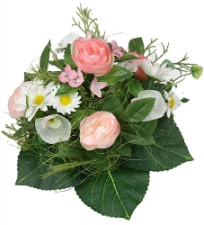 Vacker sommarbukett med olika blommor;och gröna blad.En bukett du aldrig tröttnar på och som står sig fin hela sommaren.Mått:- Höjd 22cm;; Diameter ø 17cm