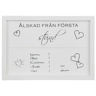 Träskylt med texten "Älskad från första stund". På baksidan finns en metallhank för upphängning. Du fyller själv i födelsedatum, tid, längd samt vikt. En fin doppresent!