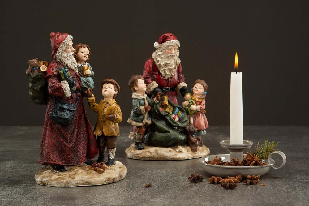 Gammaldags fin tomte med barn och julklappar, fin att placera tillsammans med dina andra juldekorationer runt om i ditt hem.