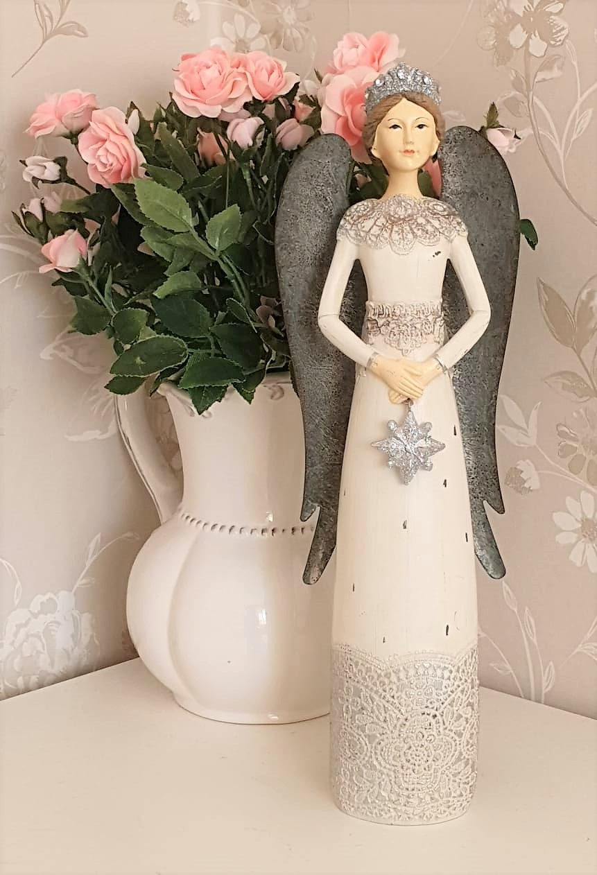 Vacker och detaljrik ängel med stora metallvingar (med lite rostig ) och en vacker dekorerad klänning med spetsmönster