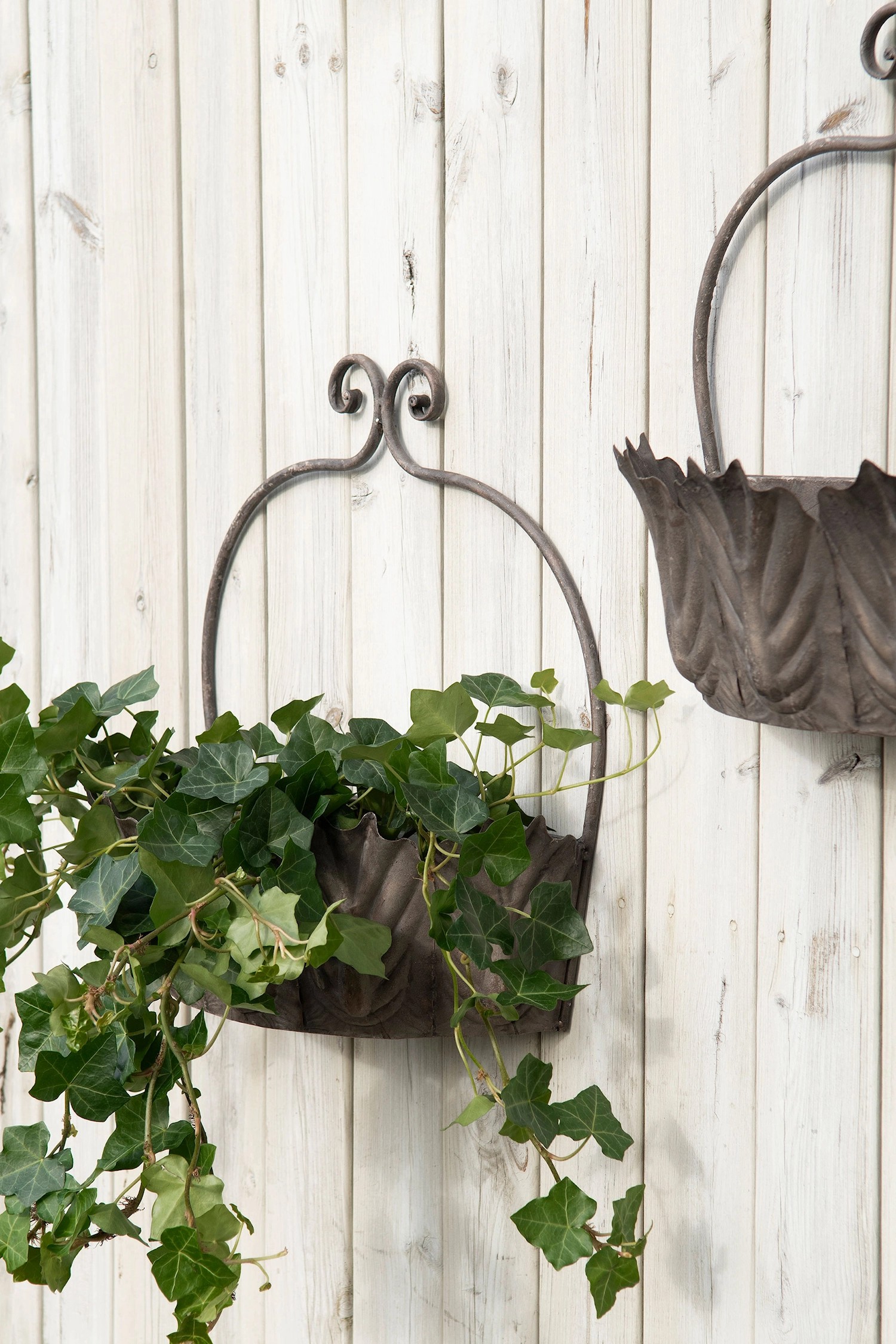 Set med två väggamplar med fina bladdetaljer att hänga på väggen. Superfin till hängande Pelargoner, petunior, och andra sommarblommor,.