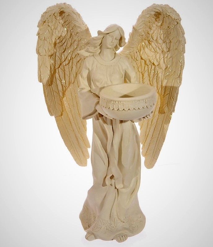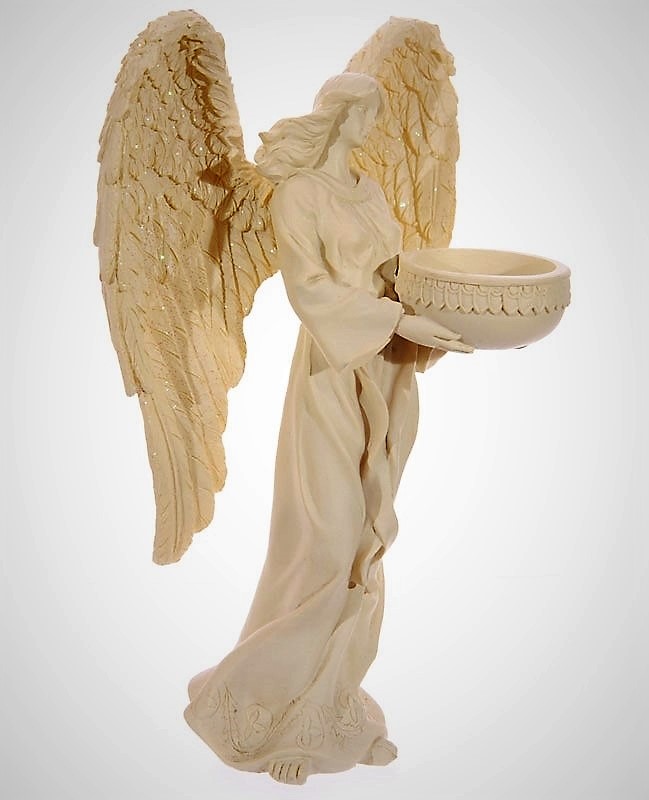 Mycket vacker ängel i cremefärg med glitter på vingarna. Ängeln håller en skål framtill för att sätta värmeljus i.