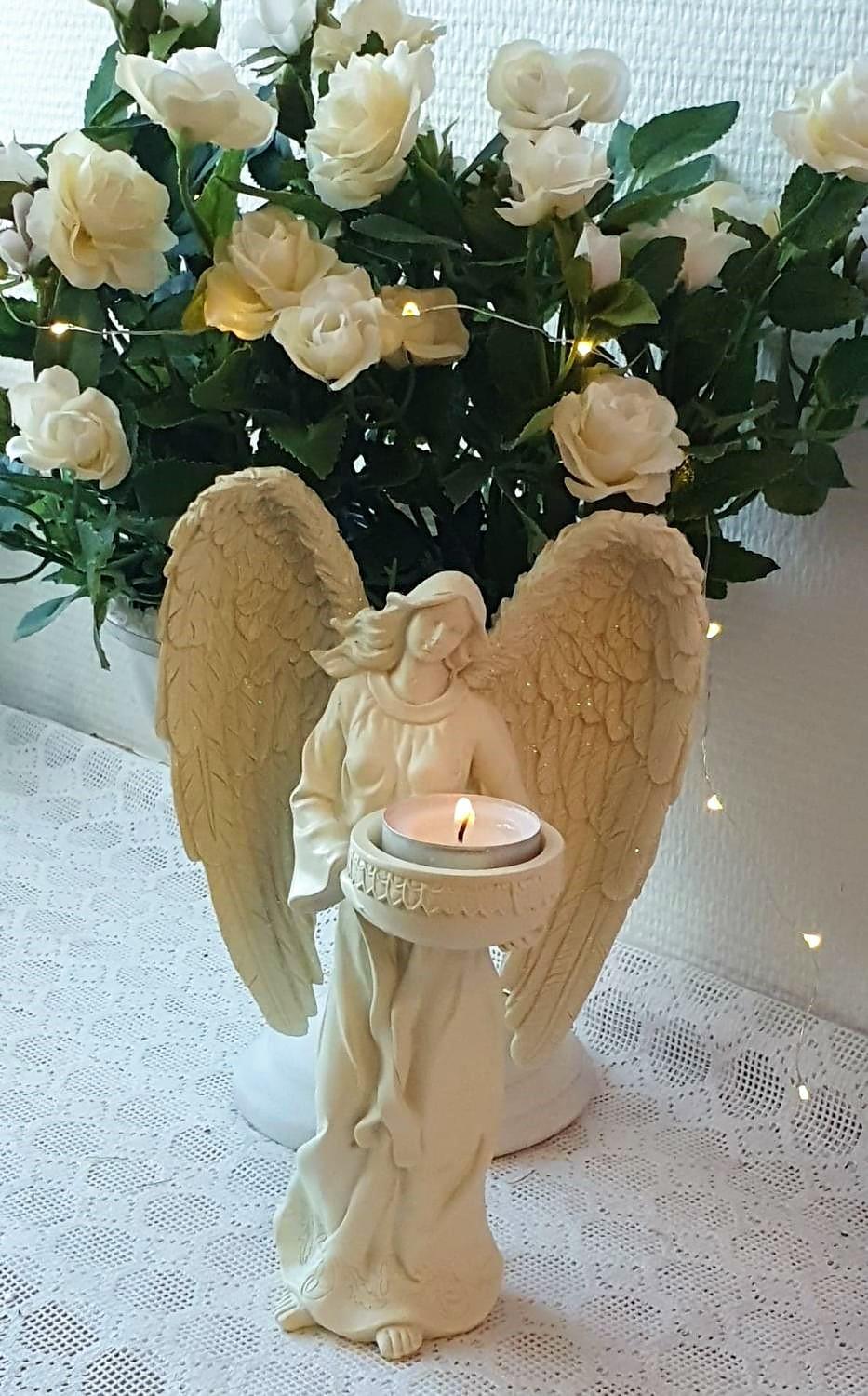 Mycket vacker ängel i cremefärg med glitter på vingarna. Ängeln håller en skål framtill för att sätta värmeljus i. Handgjorda ängel, vilket gör att d