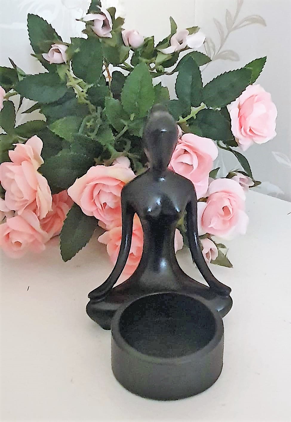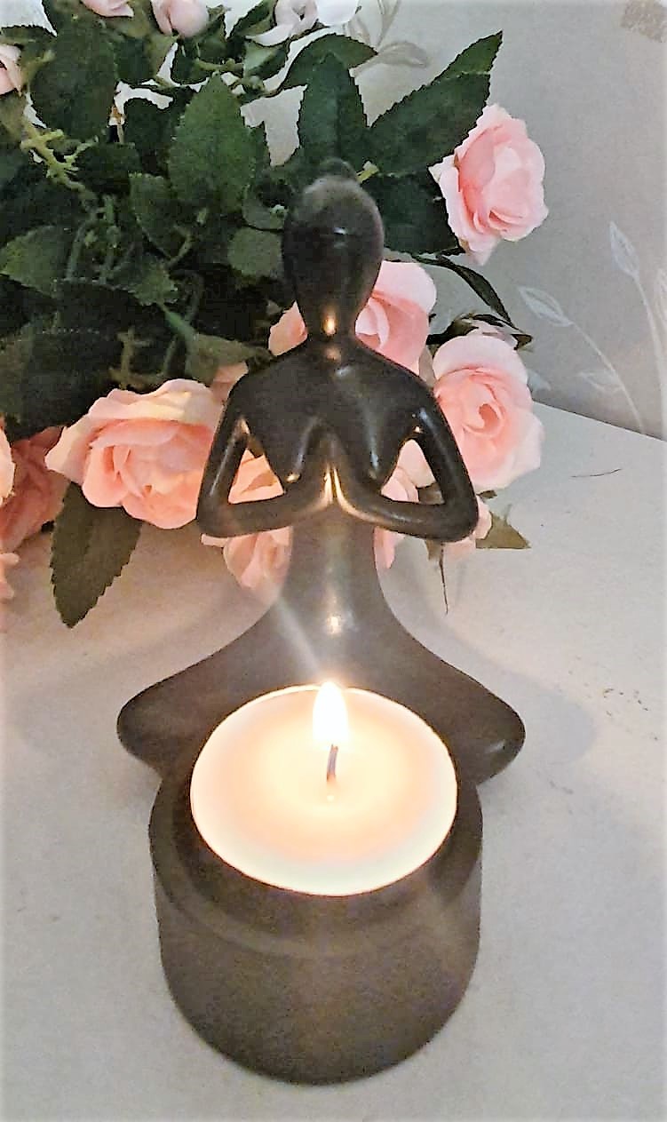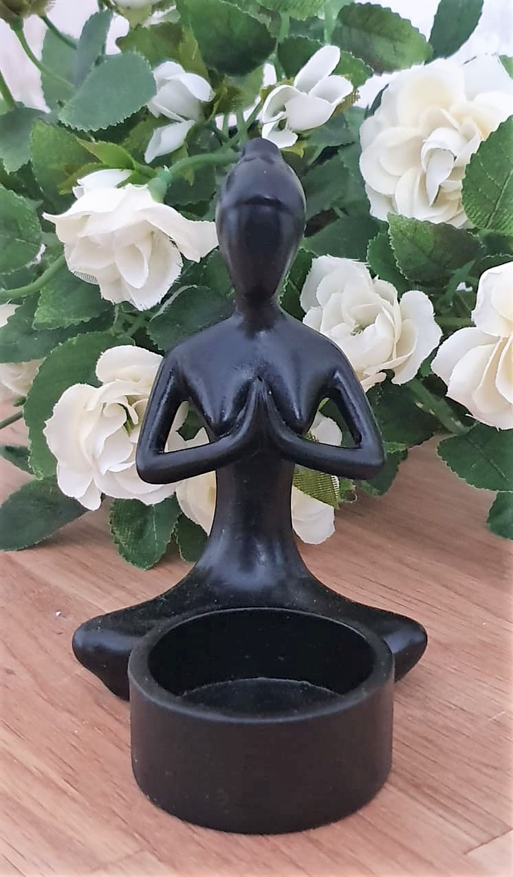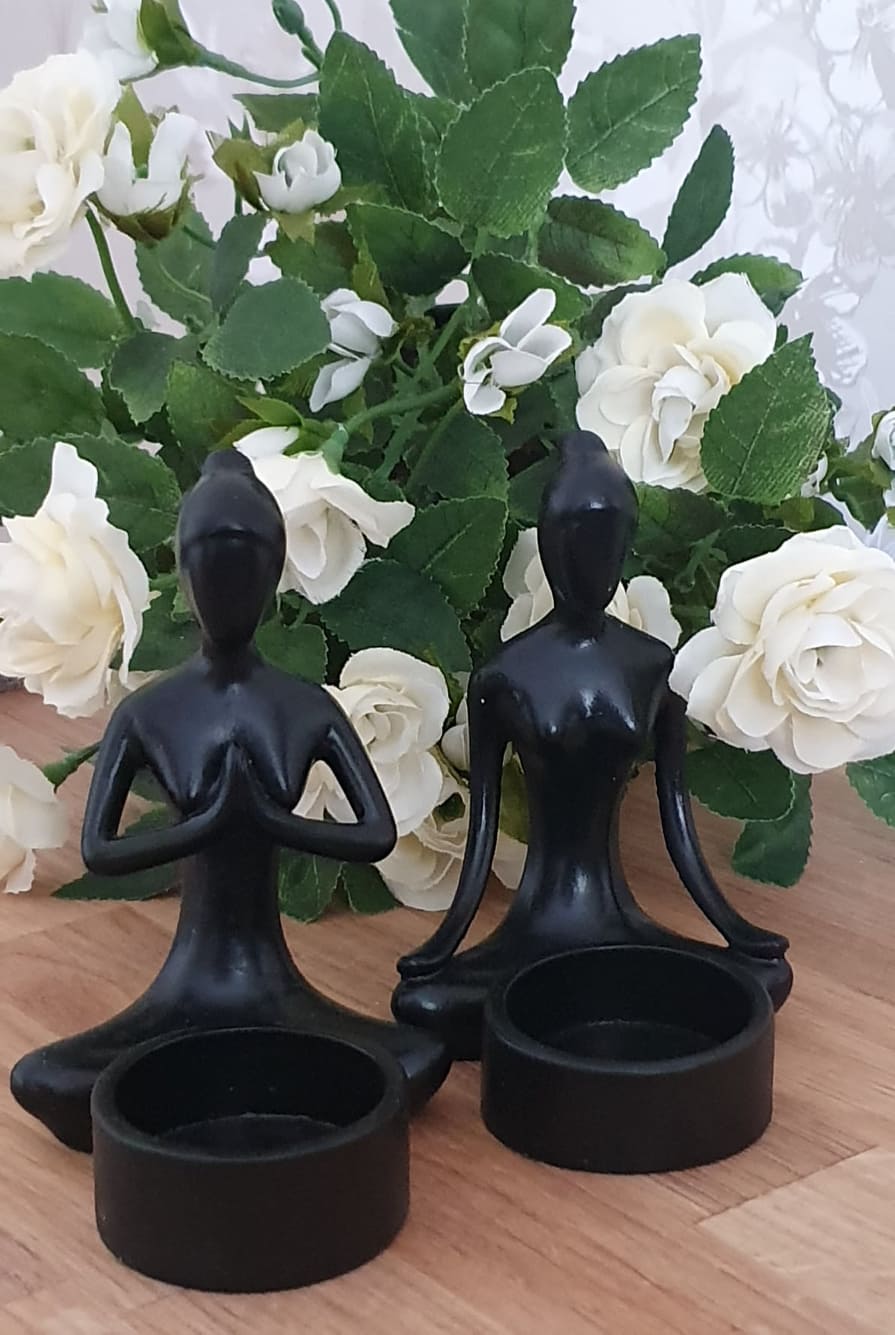 Vacker ljushållare för värmeljus i form av en kvinna i yoga position tillverkad av hård poly.