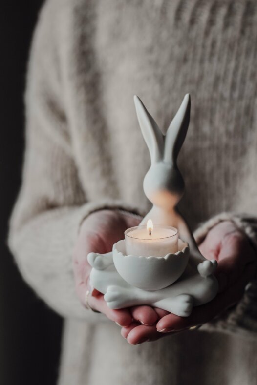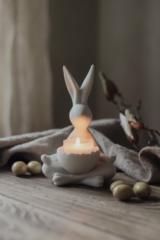 Charmig ljushållare utformad som en sittande kanin i en avslappnad yogaposition. Kaninen har en äggformad hållare för värmeljus vilket ger ett mysigt sken. Passar perfekt som dekoration i hemmet eller som en omtänksam gåva. Underbart påskpynt!